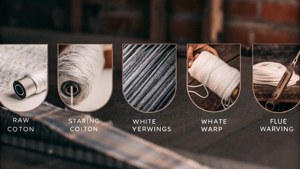 Denim making starts with dyeing cotton warp yarns with indigo. These blue yarns are then woven with natural white weft yarns in a twill pattern, creating the characteristic diagonal lines. After weaving, the fabric is finished to prevent shrinking and prepare it for garment production.