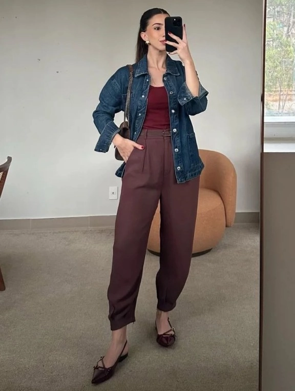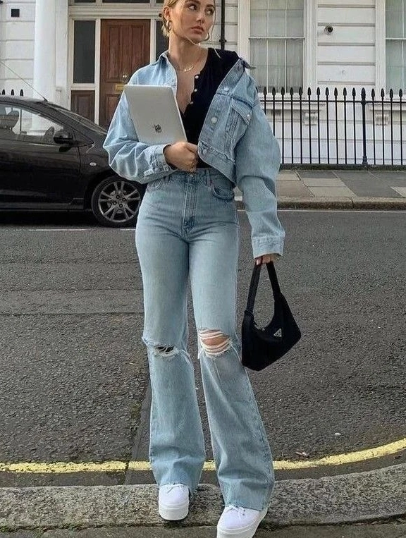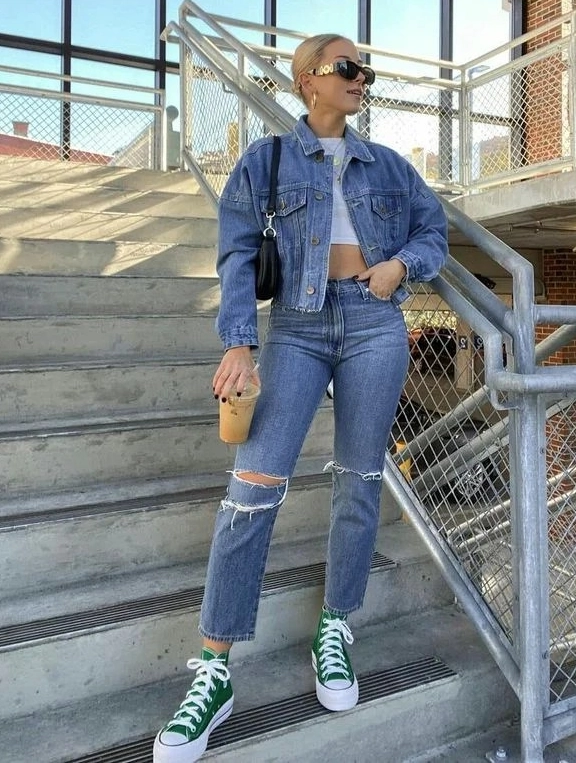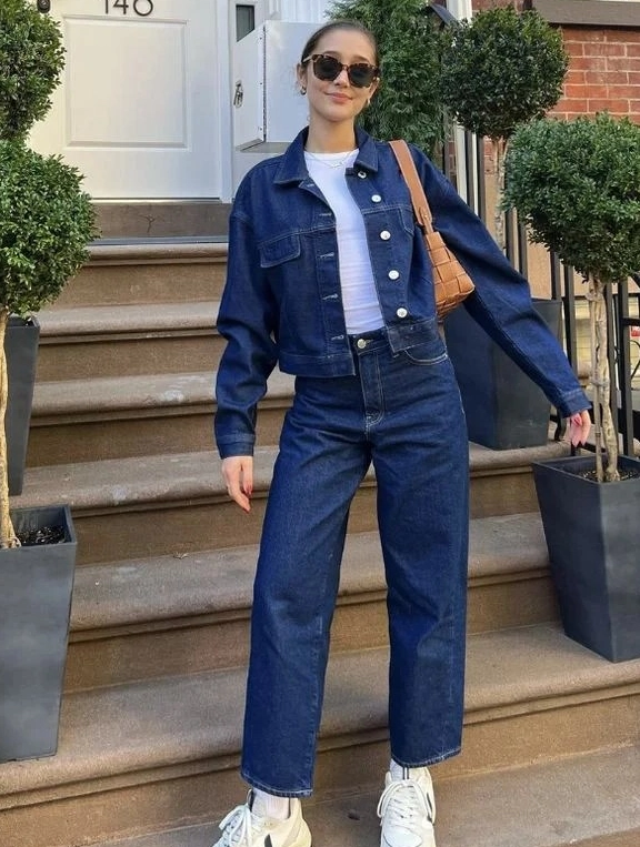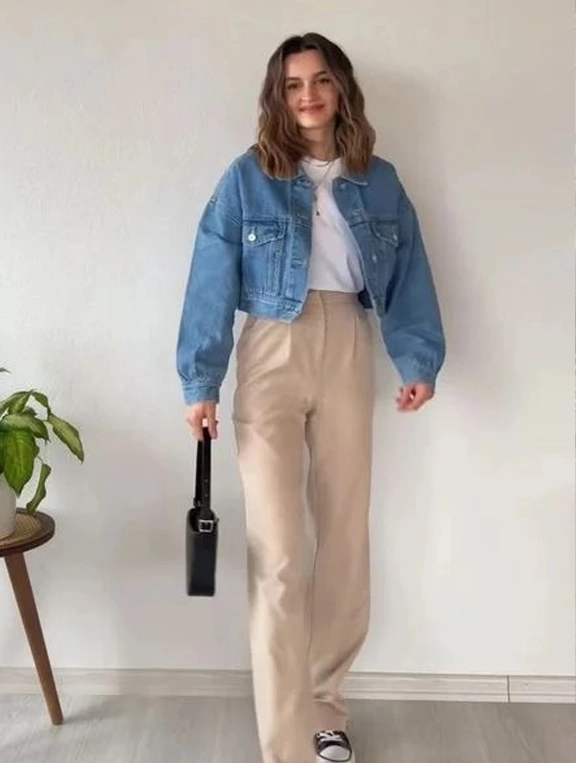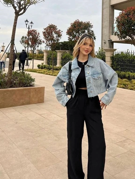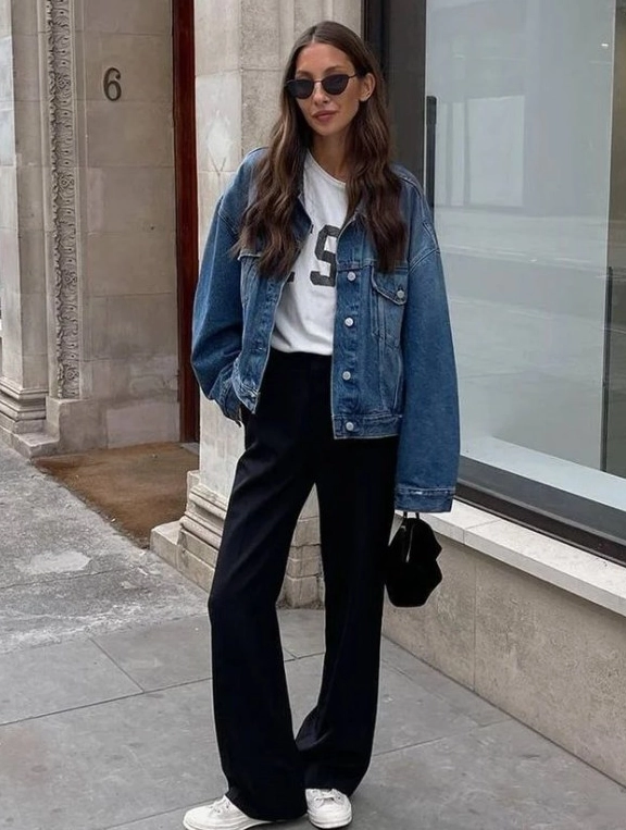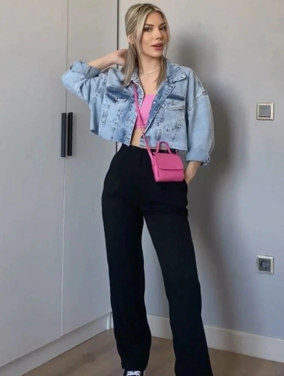 cropped denim jacket paired with black trousers is effortlessly chic. Sneakers add a sporty touch, making it great for work-to-weekend transitions.
