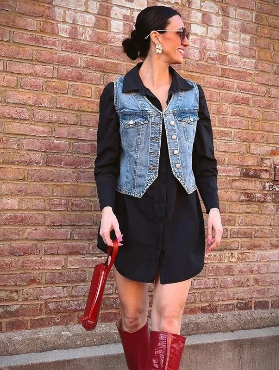 black shirt dress with a denim vest jacket creates a bold, stylish look. Complete the outfit with knee-length ankle boots for a fashion-forward vibe.