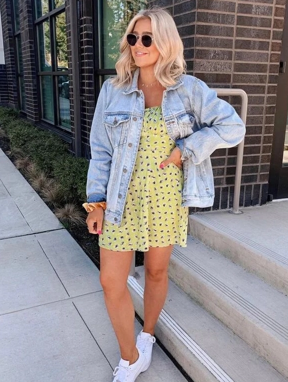 14. Mini Printed Yellow Dress Over Denim Jacket and Sneakers