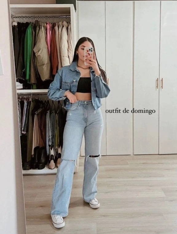 4. Trendy Top with Flare Trouser Over Cropped Denim Jacket