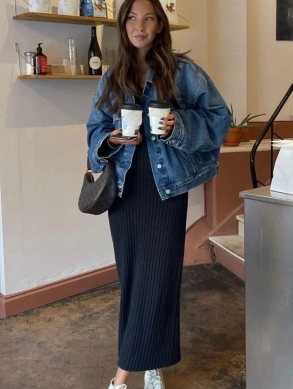 8. Denim Mini Dress Over Denim Jacket and Sneakers