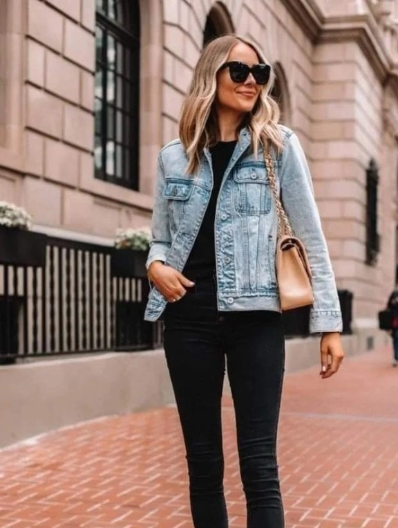 black-on-black outfit always looks chic! Add a denim jacket to break the monotony, and slip into pumps for a sleek finish. This look works great for a dinner date or a night out with friends.
