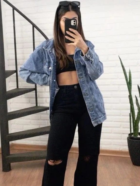 Keep things edgy with a black top and distressed jeans layered under a denim jacket. The ultimate go-to outfit for a bold streetwear vibe.