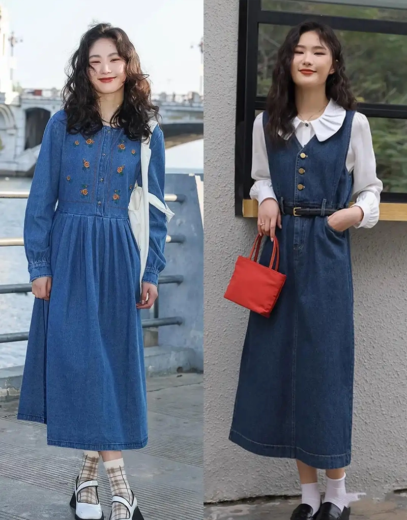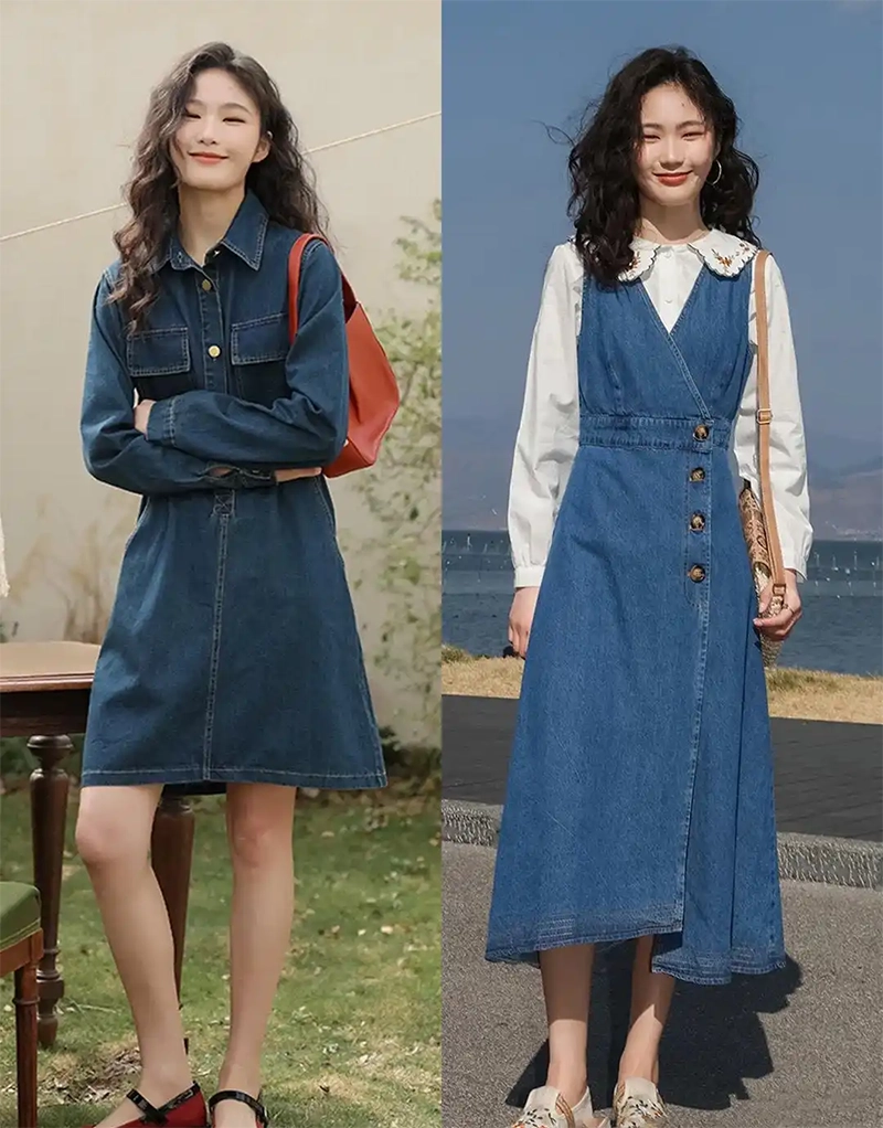 Denim dresses aren’t just for cool and bold looks; they can also be playful and cute. Cute denim dresses are often short, just below the knee, with slightly flared skirts, making them more playful and adorable, and more suitable for petite figures.