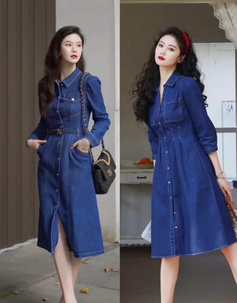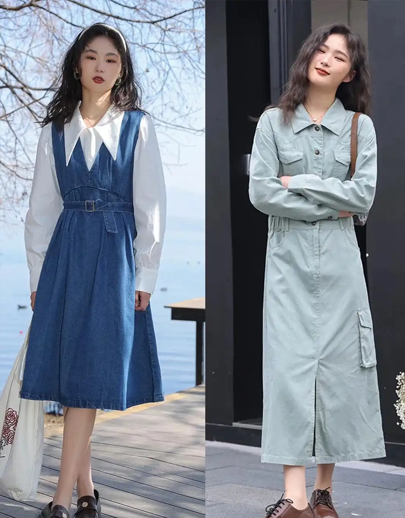 Although workwear-style denim dresses are dresses, their style is more cool and eye-catching. Workwear-style pockets, delicate small collars, and the stiff denim fabric make them very fashionable and stylish, and also provide better warmth in spring.