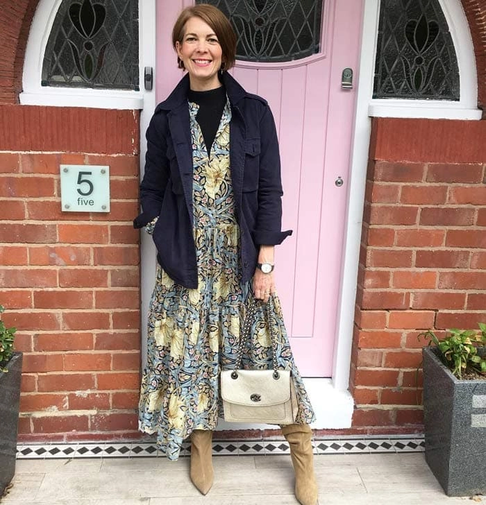 Carla (above) wears her blue denim jacket over a classic shift dress.