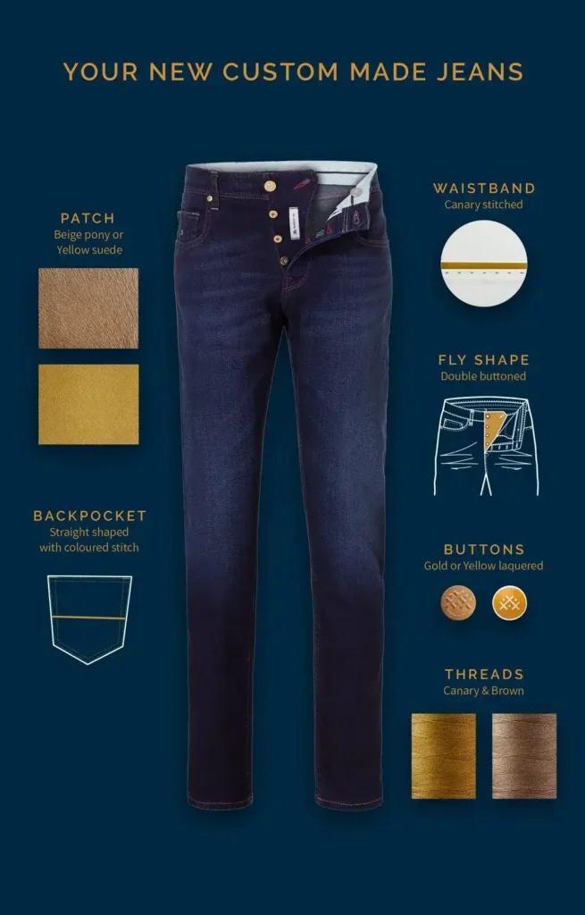 Each pair of custom-made jeans from us is individually crafted for you;a unique pattern is developed to perfectly match his style and figure.Jeans with a story.Guaranteed to turn heads.